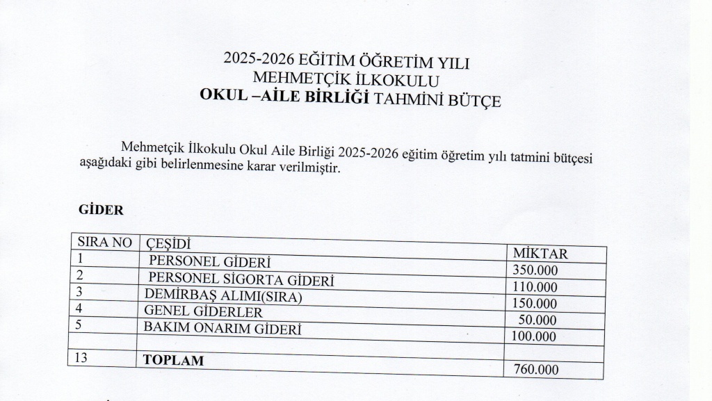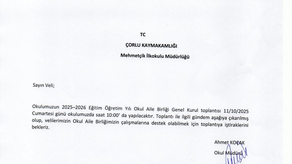 Okulumuzun 2025-2026 Eğitim Öğretim Yılı Okul Aile Birliği genel Kurul Toplantısı 11/10/2025 Cumartesi Günü saat 10:00' da yapılacaktır.
